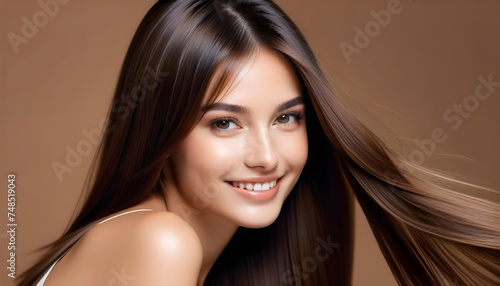 Smiling model woman with shiny brown smooth healthy hair with long straight and shining natural beauty smooth skin. For care and hair products.