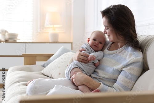 Smiling mother with her cute baby on sofa at home. Space for text