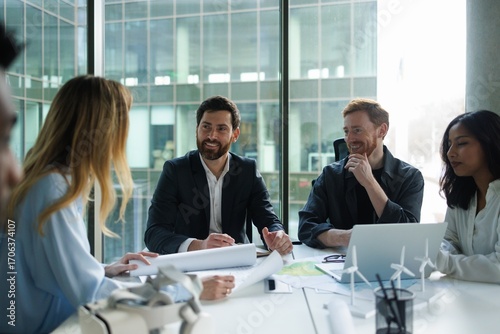 Smiling multiracial architects discuss about new residential project