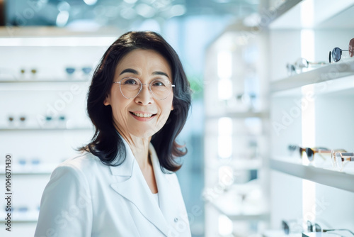 Smiling optometrist, Asian mature woman in white coat at a modern eyewear store