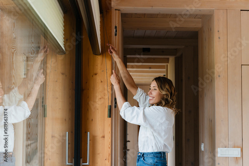 Smiling person adjusting window blinds in modern eco friendly home interior