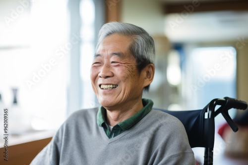 Smiling portrait of a senior Asian man in wheelchair at nursing home