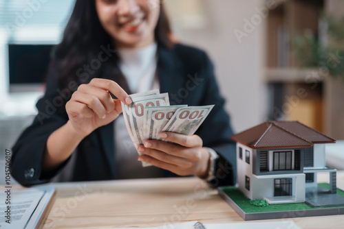 Smiling real estate agent counting money next to house model on desk, exuding success and wealth with american dollars, showcasing expertise in business and finance