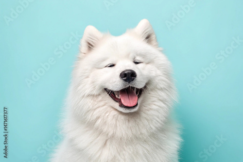 Smiling samoyed dog against a teal background showing a happy and playful expression