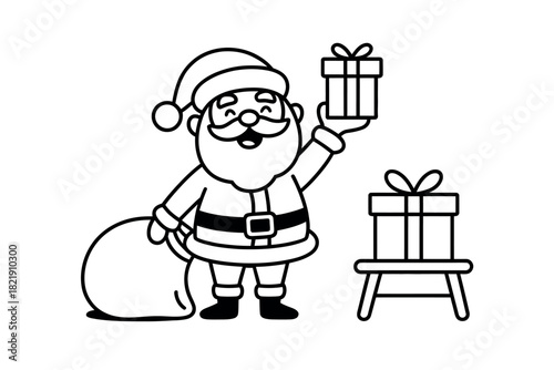 Smiling Santa Claus holding a gift and a sack of presents next to a stool with a gift on top.