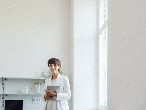 Smiling scientist with tablet PC at laboratory