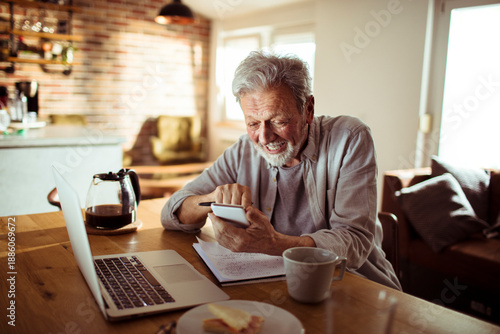 Smiling senior man using smartphone and laptop at home kitchen table