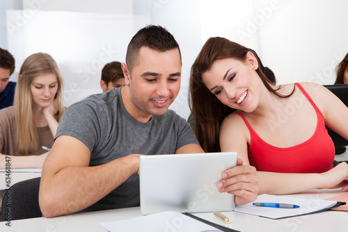 Smiling Students Using Digital Tablet In Classroom