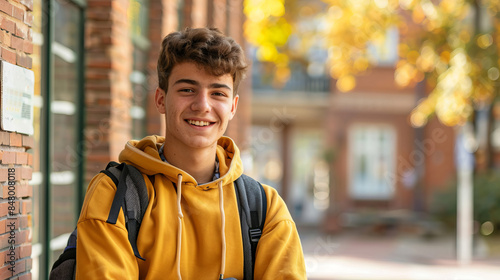 Smiling teenage male student standing outdoors in autumn