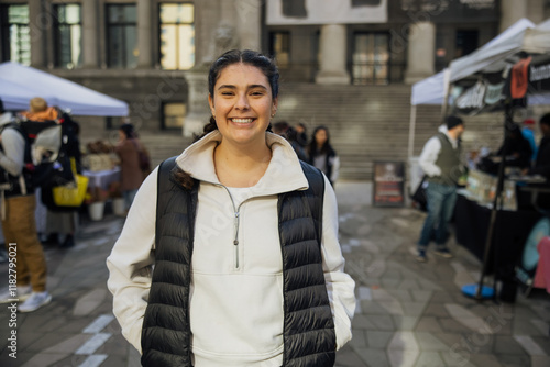 Smiling Woman Enjoying Outdoor Market in Urban Setting