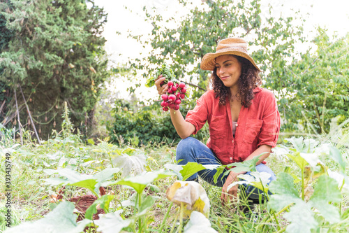 Smiling woman harvesting organic radish at vegetable garden