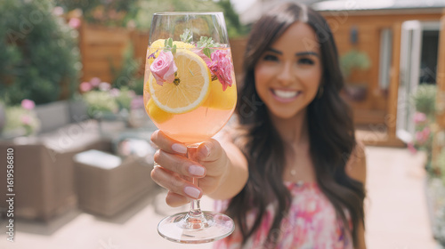 Smiling woman holding a refreshing Hugo Spritz cocktail in a sunny garden