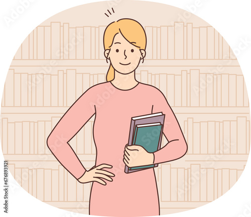 Smiling woman holding books standing in library