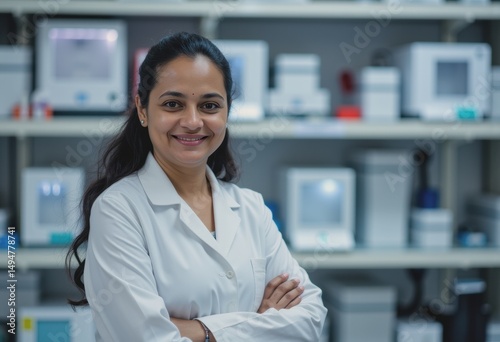Smiling woman in a lab coat standing confidently in a modern laboratory