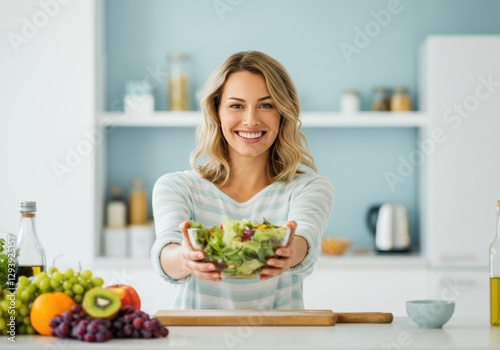 Smiling woman presenting a fresh salad in a bright kitchen setting