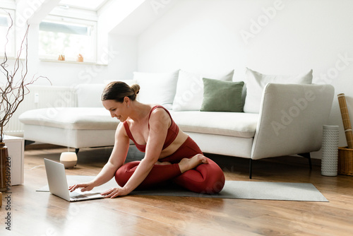 Smiling woman sitting cross-legged and using laptop on yoga mat at home