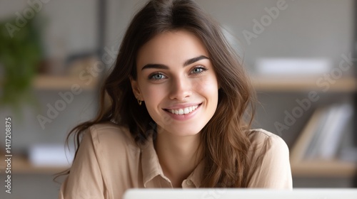 Smiling woman with beautiful eyes, posing indoor, wearing a neutral shirt