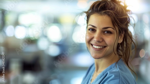 Smiling woman with brown hair wearing blue top standing in brightly lit room with blurred background.