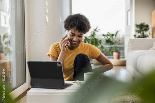 Smiling woman with digital tablet talking on mobile phone while sitting at home