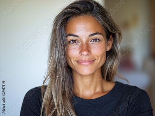 Smiling woman with long hair in a casual setting.