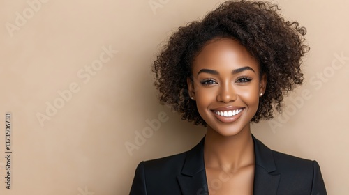 Smiling woman with natural curls wearing a black blazer in a neutral setting showcases confidence and professionalism