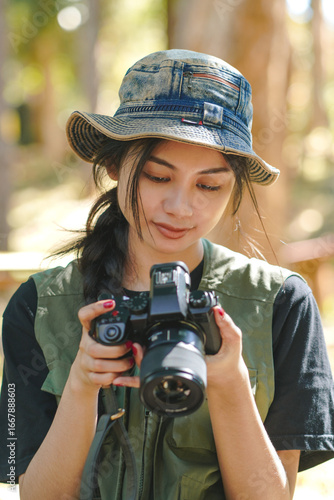 Smiling young Asian woman wearing green vest holding a camera while enjoying the forest view.