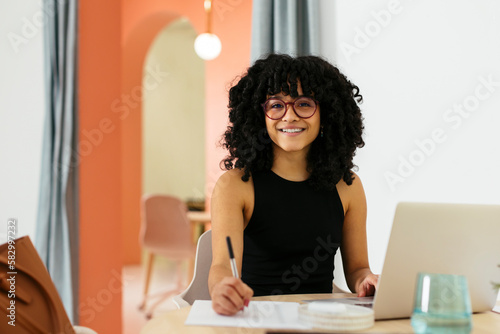 Smiling young businesswoman with Afro hairstyle working at desk in office