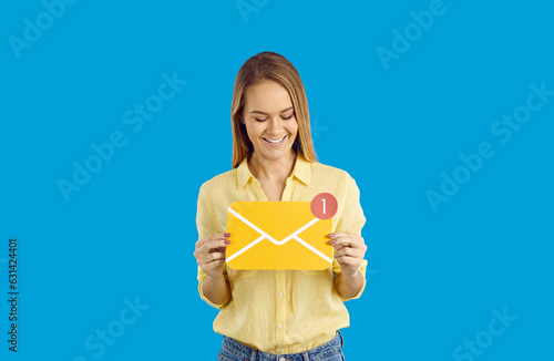 Smiling young caucasian girl isolated on blue studio background hold paper envelope with unread message. Happy woman with email notification get post by mail. Social media and communication.