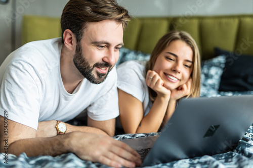 Smiling young couple using a laptop lying on their bed