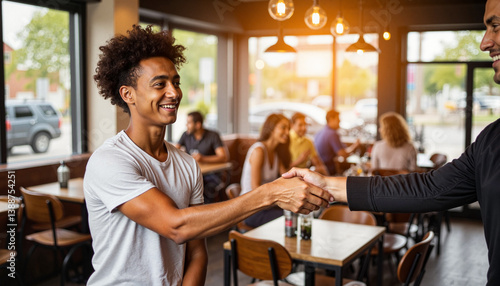 Smiling young man shaking hands in a café