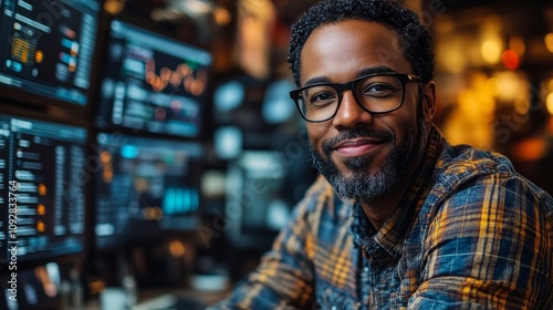 Smiling Young Man with Glasses Working in Modern Office Environment Surrounded by Computer Screens Displaying Data and Analytics in Professional Setting