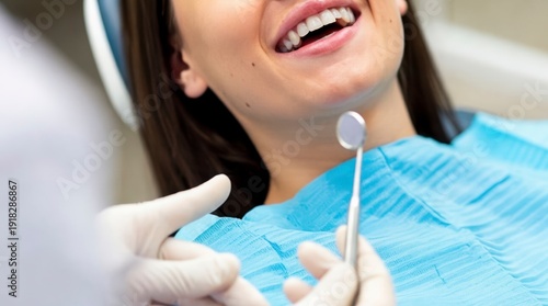 Smiling Young Patient in Dental Consultation, Hispanic Woman Receiving Teeth Inspection and Preventive Treatment in Modern Clinic with inspection