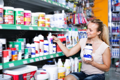smiling young woman customer choosing paint medium in bottle in hypermarket