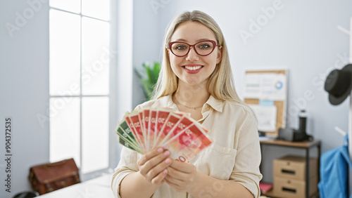 Smiling young woman in office holding israeli shekels, portraying success and finance.