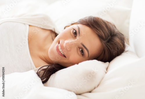 smiling young woman lying in bed at home