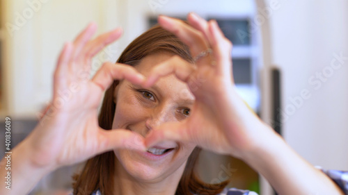 Smiling young woman showing hands sign heart shape looking at camera at home
