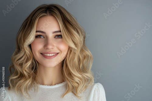 Smiling young woman with wavy hair poses against a gray background