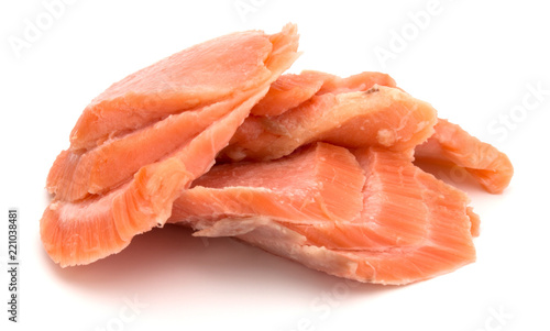 smoked salmon segments isolated on white background cutout. Prepared fish fillet fibres.