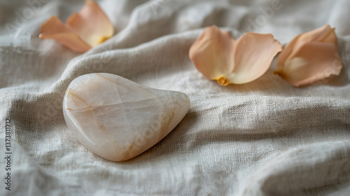 Smooth stone and flower petals on linen cloth, creating a soft, natural and relaxing composition.