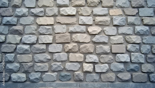Smooth texture of a gray cobblestone wall or road backdrop. A path or pathway with a repeating surface pattern of tileable, gritty natural rock and stone. A 3D representation of a construction backgro