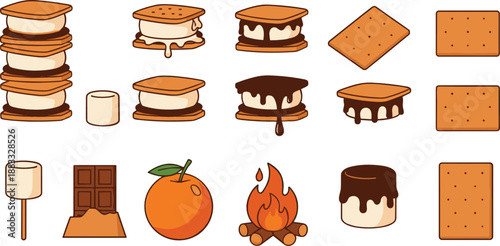 S'mores Dessert Ingredients Collection with Graham Crackers Marshmallows Chocolate Campfire Camping Flat Vector Illustration Set