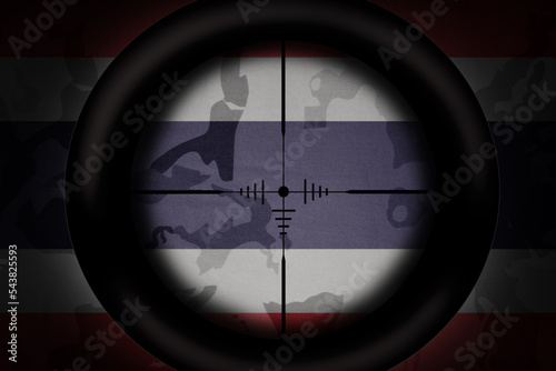 sniper scope aimed at flag of thailand on the khaki texture background. military concept. 3d illustration