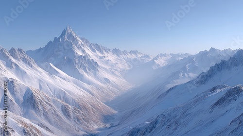 Snow Capped Alpine Mountain Cinematic HDR Panoramic View Under Blue Sky Sunlight Illuminates Mountain Range Cold Weather Winter Landscape Scenery