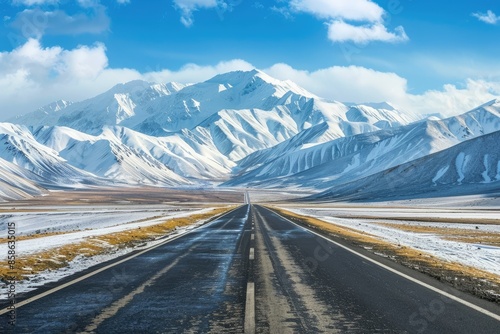 Snow capped mountains and asphalt road under blue sky