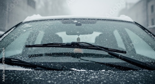 Snow Covered Car Windshield During Winter Storm in Urban Setting