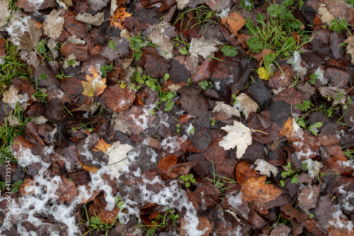 snow covered grass with leaves