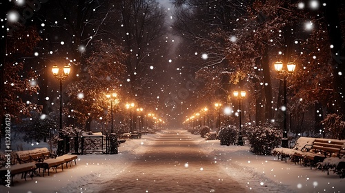 Snow falls on a winter pathway with lit street lamps