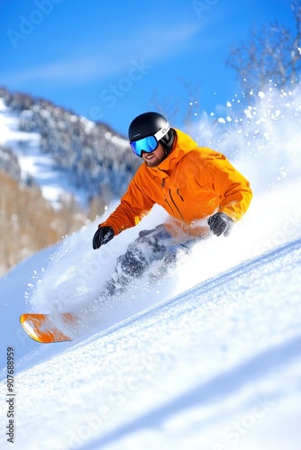 Snowboarder carving through fresh powder on a sunny winter day in the mountains