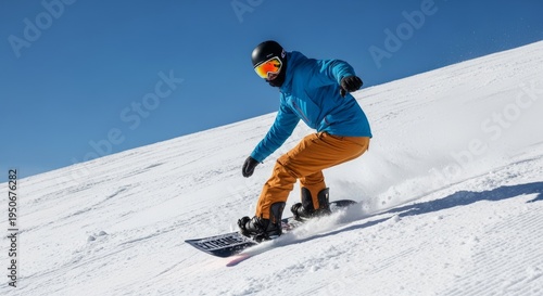 Snowboarder in blue jacket carving down snowy slope on sunny day