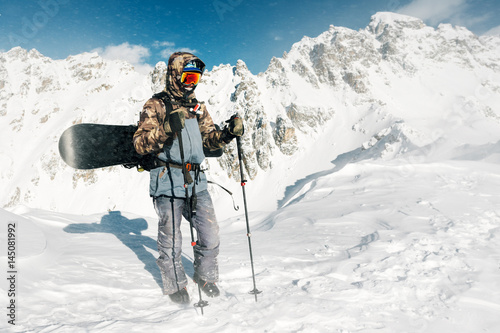 Snowboarder is standing with snowboard
